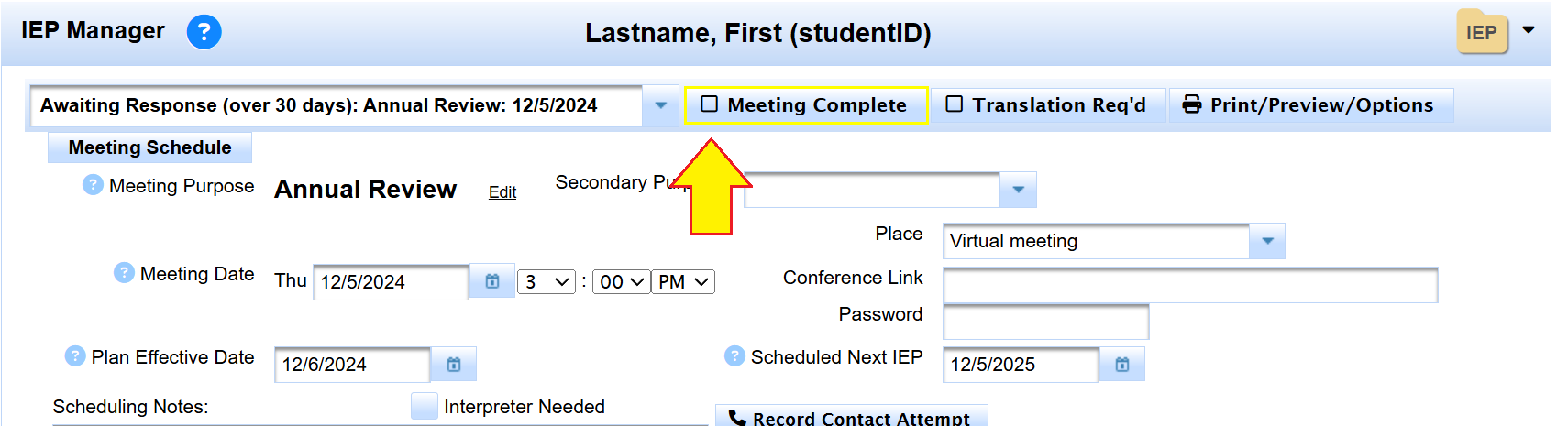 - Check Meeting Complete once the meeting is completely finished.