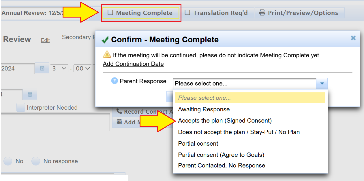 - Once the parent signs the Consent for Placement form in agreement, you may select the Parent Response: Accepts the Plan and then Finalize the meeting.