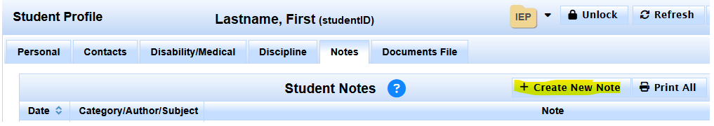 When notes are in a student list, all notes for the student are included on one line. The summary 'notes' box will contain the category, added by, and note date preceding the note text.