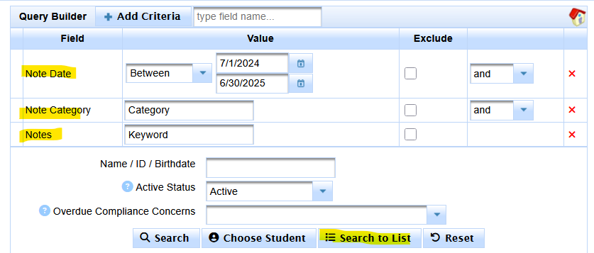 - Add Criteria of 'Note Category' to search the students that have a note with that category.