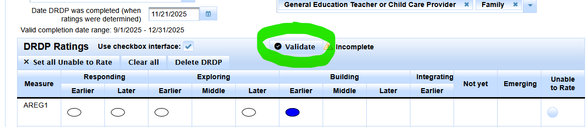 - Validate - Validate DRDP record for data entry errors. (shown in upper right hand corner)