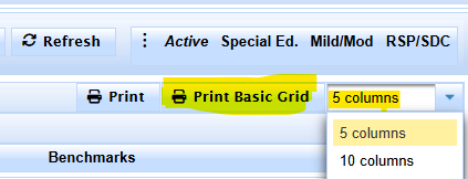 This will create a list of your goals and/or goals and benchmarks which can be printed out and used to collect data about the student’s progress. Above you would enter the date and in the boxes write the score that correlates with the date above and the goal/benchmark to the left.
