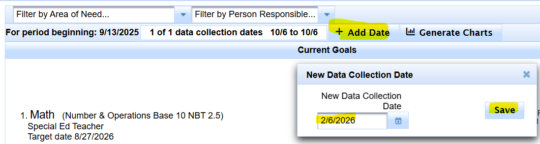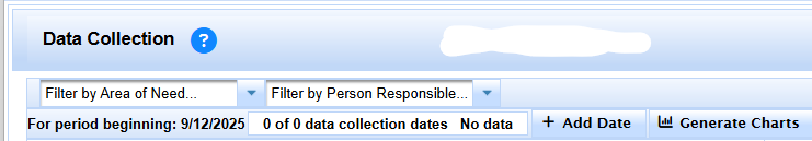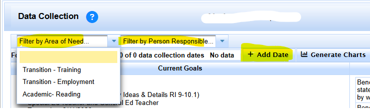 Using the Data Collection Chart will log and graph the student’s progress meeting their goals and/or goals and benchmarks. To use this feature after clicking on the ‘Add Data Collection Date’ you must enter the collection date. Then over to the right add a score and percentage of achieved by moving the slider. The slider generates percentage achieved that plots the point on the graph.