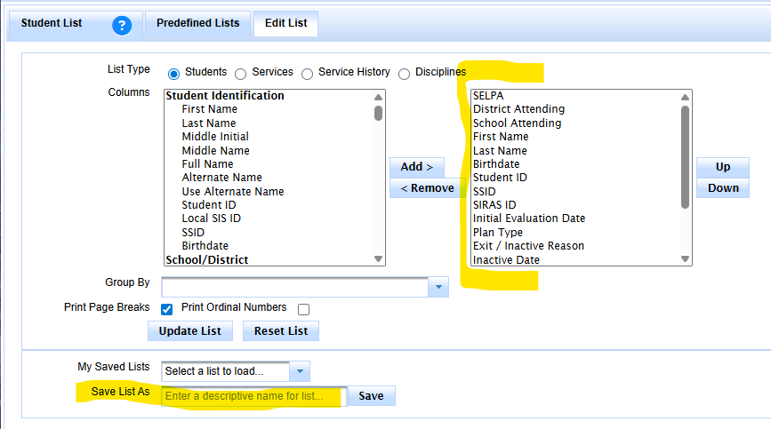 The list at the left (to the right of the word Columns) shows the list of all fields that can be used to create a customized list. The list in the box at the right shows the fields that are currently in that list: School Attending, Birthdate, Grade, Last IEP Date, Last Evaluation Date, Primary Disability, and Primary Service. Note that the columns on the report going from left to right are exactly the same order as the list in the box on the right going from top to bottom.