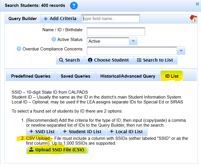 This function provides a way to select found set of Students by providing an uploaded CSV (comma-separated value) file containing SSIDs.