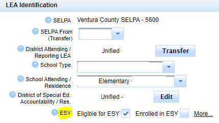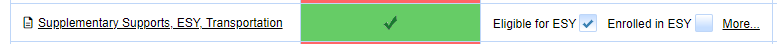 - Extended School Year (ESY) Eligible vs. ESY Enrolled: ESY prompts include both eligible and enrolled. ESY Eligible is determined during the IEP Meeting; and ESY Enrolled is determined when the parents have confirmed that their child will be attending ESY. ESY should be considered on an annual basis by the IEP team. An ESY consideration worksheet is located in the Tools>Added Forms area under the IEP category and should be used according to your District’s procedural guidance. The ESY Eligible and the ESY Enrolled checkboxes can be found on the MIS Summary Page in the LEA Section; and in the Forms Manager next to the ESY Services / Transportation / Supplementary Supports form. Additional ESY information such as the site, teacher, and dates can be added by clicking “More” in either of these two areas or can be accessed directly under Student Info>Special Ed Profile>Program. ESY Transportation details can be entered under the Setting and Transportation tab of the Special Ed Profile