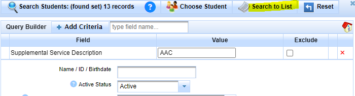 Supplementary Supports: Locate the supplementary supports that you are responsible for by searching for Supplementary Description. Go to the Search button, add criteria and Search to List. See example. A list of all supplementary services can be printed from Reporting>Student Lists>Predefined Lists and then selecting Service- Supplementary Services from the General Lists section. This list may also be exported to an excel file for easier sorting. Supplementary Services should be reviewed at least annually by the IEP team and should not be added without the input of the service provider involved. Please remember to invite those service providers to your IEP meetings.
