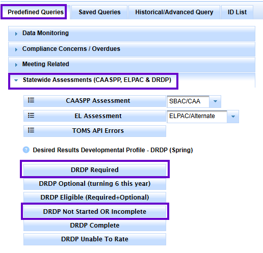 - Spring DRDP: All infants and preschoolers through the age of 5 who have begun SPED services before April 1 (in any district) will need to have a DRDP. The DRDP is not required for students turning 6 by June 30 unless your Director chooses to have everyone assessed. DRDP data must be entered into SIRAS by Friday, May 22nd. Locate all DRDP required students by going to the Search button/Predefined Queries/Statewide Assessments (CAASPP, ELPAC & DRDP). The DRDP measures student development as well as student growth. It is not recommended to have the Spring DRDP administered too closely to the Fall DRDP to allow for this growth.
