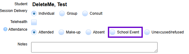 - A new Attendance button was added to the Service Logs last year. “School Event” may be used for the designated reasons given to us by CDE to assist with IEP Implementation Monitoring: Field trips, Statewide testing periods, Student benchmark testing, Special programming at the school site (e.g. school assemblies), and School-related emergencies.